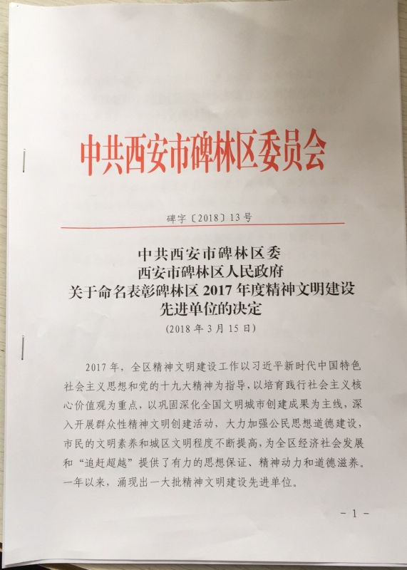 2017年,陜西千方科技發(fā)展有限責任公司申請“區(qū)級文明單位”,經(jīng)過一年的努力,公司在參與文明城市建設(shè)、學雷鋒、樹立公司形象等方面取得了一定成績,并于2018年3月20日正式授牌。