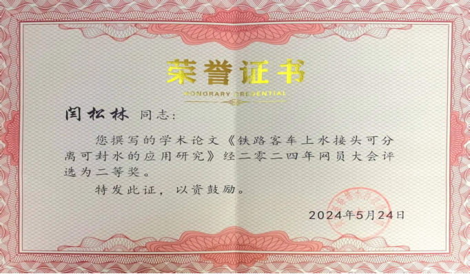 在2024年鐵路給排水科技情報網(wǎng)年會中,我公司總經(jīng)理閆松林撰寫的學術(shù)論文《鐵路客車上水接頭可分離可封水的應(yīng)用研究》經(jīng)2024年網(wǎng)員大會評選,榮獲2024年度鐵路給排水科技情報網(wǎng)優(yōu)秀論文二等獎。